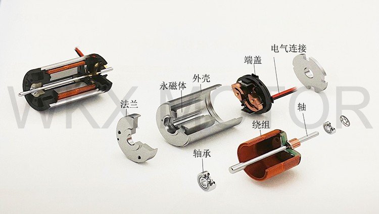 The coreless cup motor is mainly composed of a back cover, terminal block, brush end cap, brushes, commutator, cup-shaped winding (rotor), shaft, washers, sliding bearings, housing, magnet (stator), flange, and a locating ring.